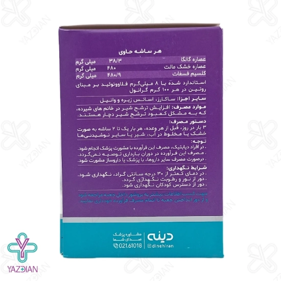 در تهیه گرانول لاکتودین دینه علاوه بر این گیاه از عصاره مالت نیز جهت تقویت شیر استفاده شده است و وجود فسفات کلسیم در این محصول نیز آن را به مکمل مفیدی جهت جبران کمبود کلسیم در زنان شیرده تبدیل کرده است. گرانول لاکتودین دینه همچنین حاوی اسانس زیره، اسانس رازیانه و وانیل می باشد که از طرفی خواص شیر افزایی این فرآورده را افزایش داده و از طرفی اثرات ضد نفخ و خوش طعم کننده دارند.