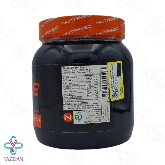 پودر نیترو بمب نوتریمد Nutrimed Nitro Bomb Powder شامل مواد محرک و آمینو اسیدهایی است که باعث افزایش انرژی، پمپاژ خون و قدرت عضلانی میشود. همچنین، این مکمل انرژی زا باعث رشد و ترمیم بافتهای عضلانی، تاخیر در خستگی هنگام تمرینات هوازی، افزایش تعریق و بهبود خون رسانی به بافتهای عضلانی میشود. ترکیبات موجود در نیترو بمب نوتریمد باعث افزایش سطح هورمون رشد نیز میشود.