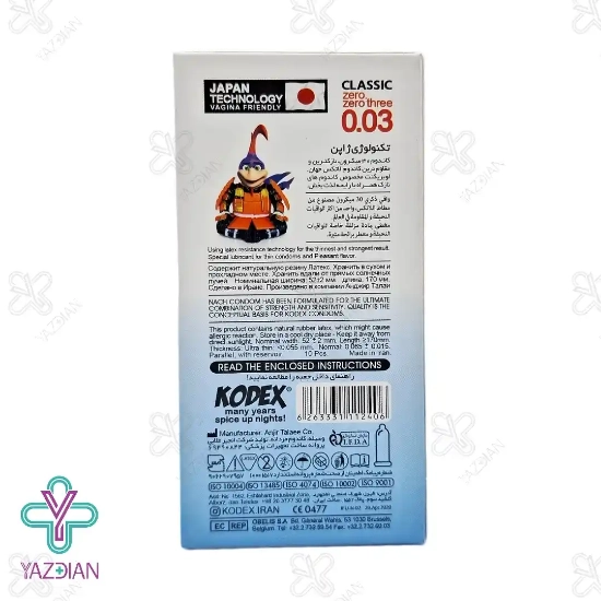 کاندوم کدکس، تحت لیسانس کشور ژاپن از جنس لاتکس صددرصد طبیعی و با کیفیت است که دارای خاصیت ارتجاعی بسیار بالا و مقاوم به پارگی است.