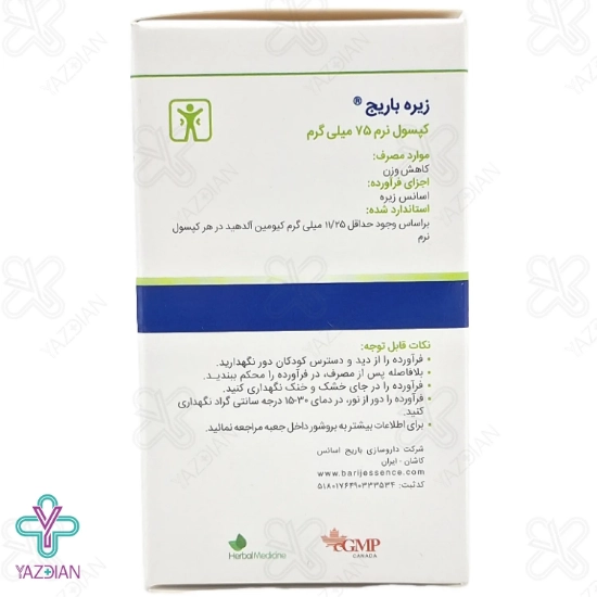 کپسول زیره باریج اسانس، یک داروی گیاهی برای لاغری است که حاوی اسانس زیره است. این کپسولها به صورت خوراکی مصرف میشوند و ممکن است برای تسکین علائم سوء هاضمه، نفخ معده و دیگر مشکلات گوارشی مفید باشند. همچنین، برخی افراد از کپسول زیره باریج اسانس برای بهبود عملکرد کبد، کاهش سطح چربی در کبد، افزایش سوخت و ساز بدن و کاهش اشتها استفاده میکنند.