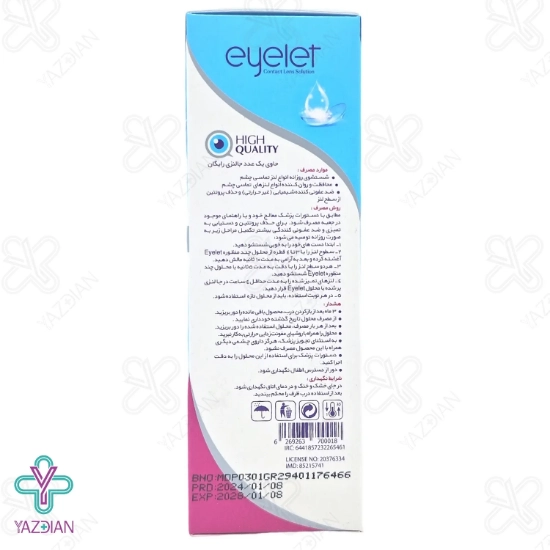 محلول شستشوی لنز آی لت (Eyelet Contact Lenses Multi Purpose Solution) با بهره گیری از ترکیبات مفید و مؤثر موجود در فرمولاسیون خود می تواند انواع لنزهای سافت، رنگی یا طبی را ضد عفونی کرده و ضمن ممانعت از ایجاد پروتئین، رسوب و آلودگی در سطح لنز، آن ها را نرم نگه دارد.