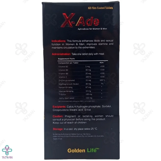 قرص تقویت آقایان و بانوان ایکس اید گلدن لایف (Golden Life X-Ade 60 Tab)، حاوی ترکیب ویژه ای از ویتامین ها، گیاهان دارویی و مواد معدنی بوده که نقش بسزایی در تقویت میل و قوای جنسی خانم ها و آقایان دارد. این قرص لذت جنسی برای رسیدن ارگاسم را در هر دو جنس زن و مرد زیاد کرده و تمایلات و توانایی آن ها را دو چندان می کند. بعلاوه میزان انرژی و قوای جنسی را افزایش داده و هورمون های جنسی را تنظیم می کند.