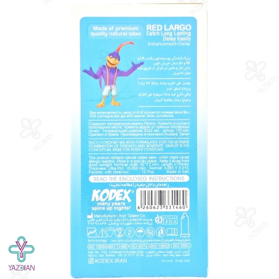 کاندوم تاخیری رد لارگو کدکس (Kodex Red Largo Condoms – 12 PCS) سبب گشودن رگ ها شده که با خون رسانی به آلت تناسلی دو طرف رابطه سبب برانگیختگی در آن ها و در نتیجه بالا بردن مدت زمان لذت جنسی می شود و خرید کاندوم کدکس بسیار به زوجین توصیه می شود. این محصول میزان خون رسانی به آلت تناسلی مردان را افزایش داده و به دلیل این که به ژل لوبریکانت آغشته شده است در نتیجه سبب افزایش حجم، سفت و بزرگ شدن آلت و به وجود آمدن لذت در دو طرف رابطه می شود.