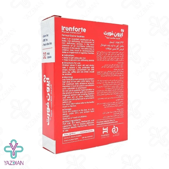 کپسول آهن آیرون فورت فارمد(pharmed Salamat Sina Ironfort 32 Caps) یک مکمل با پلت های دارای پوشش روده ای است و باعث کاهش عوارض گوارشی ناشی از مصرف آهن همچون تهوع، درد و ناراحتیهای معده می شود زیرا داروهایی که پوشش روده ای دارند در محیط اسیدی معده باز نمی شوند و جذب آن ها در دوازدهه که محیطی قلیایی است صورت می گیرد و جذب خون می شوند.