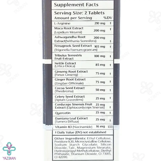 این قرص دارای عصاره گیاهی مفید همچون ریشه ماکا، عصاره دانه شنبلیله، عصاره میوه تریبولوس، عصاره ریشه جینسینگ، عصاره زنجبیل، عصاره دانه کرفس و همچنین ال آرژنین و ویتامین B3 می باشد که می تواند از بروز مشکلات جنسی شایع در آقایان همچون اختلال در نعوظ و کاهش میل جنسی جلوگیری کند.