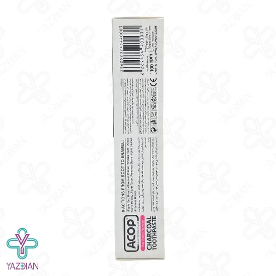 خمیر دندان زغالی آکوپ (Acop charcoal toothpaste - 90 gr) دارای زغال فعال یا کربن اکتیو است و ذرات ریز که باعث تغییر رنگ دندان ها می شود را از روی سطح دندان ها پاک می کند و به همین دلیل دندان ها درخشان و سفید می شود، از دیگر ویژگی های این محصول این است که هیچ نوع رنگ سیاهی بر روی زبان، مخاط دهان، لباس، سینک و تغییر رنگ برس مسواک ایجاد نمی کند.