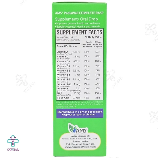 قطره پدیاول کامپلیت ای ام اس (AMS Pedia Well Complete 30 ml) مواد مغذی و مورد نیاز بدن کودکان را فراهم می کند. این محصول در حفظ سلامت عمومی بدن و رشد کافی کودکان بسیار تاثیر گذار بوده و به دلیل داشتن طعم دل نشین تمشک بدون بهانه گیری از آن استفاده می کنند.