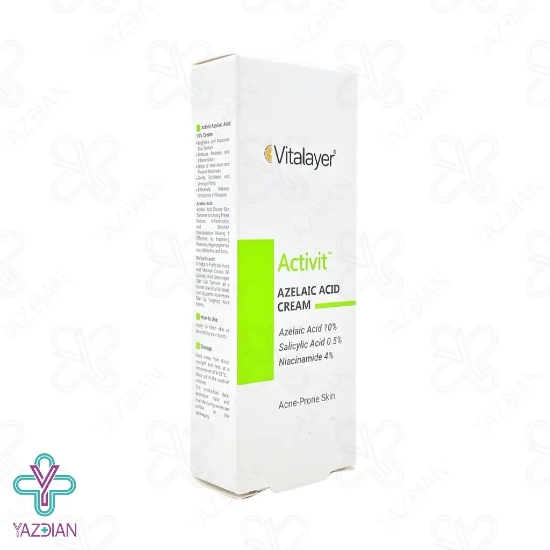 کرم آزلائیک اسید 10% اکتی ویت ویتالایر (Azelaic acid cream 10% activit vitalayer – 30 ml) دارای ترکیبات موثری است که موجب کاهش التهاب، آکنه و روشن شدن پوست می شود این محصول برای پوست های چرب، مختلط و آکنه ای طراحی شده است آزلائیک اسید موجود در این محصول موجب رفع مسدود شدن منافذ پوست شده و تولید چربی اضافه را کاهش می دهد و در نتیجه آکنه های پوستی را بهبود می بخشد و موجب یک نواخت شدن رنگ پوست و روشن شدن لک های ایجاد شده در اثر جای جوش و آکنه شده و در بهبود روزاسه و پلاسما نیز موثر می باشد سالیسیلیک اسید موجود در این محصول موجب لایه برداری ملایم شده و به صورت عمقی در منافذ نفوذ کرده و چربی و سلول های مرده پوست را رفع می کند و با پاک سازی منافذ و جلوگیری از مسدود شدن آن ها از ایجاد جوش جلوگیری می کند نیاسینامید موجود در این محصول موجب کاهش قرمزی و التهاب پوست شده و با بهبود بافت پوست موجب شده تا ظاهری روشن و شفاف داشته باشید و در صورتی که به صورت مداوم از این محصول استفاده کنید ضمن رفع التهاب و جوش موجب روشن، یکنواخت و سالم تر شدن پوست می شود.