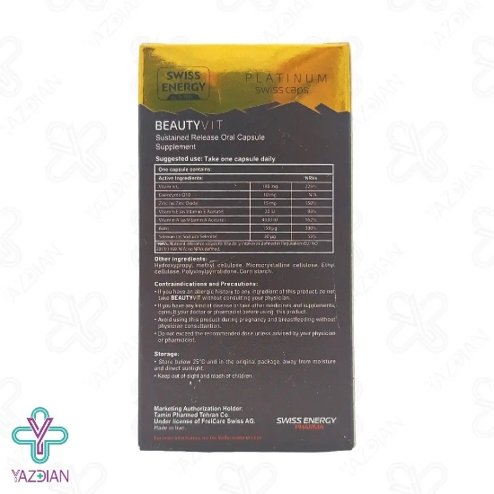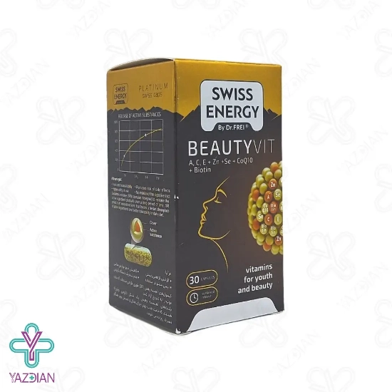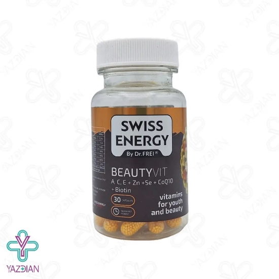 کپسول ضد ریزش مو بیوتی ویت سوئیس انرژی ( Beauty Vit Swiss Energy capsules ) یک مکمل غذایی است که ضمن حفظ سلامت و تقویت پوست موجب تقویت مو و ناخن نیز می شود در این محصول از بیوتین، ویتامین های A،C،E و مینرال های زینک و سلنیوم و کوآنزیم کیوتن استفاده شده است این محصول با خاصیت آنتی اکسیدانی که دارد موجب محافظت سلول ها در برابر آسسیب های ناشی از رادیکال های آزاد می شود کپسول ضد ریزش مو بیوتی ویت موجب تحریک تولید کلاژن و از سلول های پوست حمایت می کند که موجب حفظ شادابی، زیبایی و جوان سازی پوست می شود و هم چنین موجب کند شدن روند پیری پوست می شود این محصول هم چنین موجب تقویت ریشه موها و استحکام آن شده و شکنندگی ناخن ها را کاهش می دهد ویتامین C موجود در این محصول موجب تولید کلاژن شده که موجب افزایش استحکام و خاصیت ارتجاعی پوست می شود ویتامین C دارای خاصیت آنتی اکسیدانی بوده که از پوست در برابر آسیب های ناشی از رادیکال های آزاد محافظت کرده و موجب کاهش چین و چروک پوستی می شود ویتامین E و کوآنزیم Q10 دارای خواص آنتی اکسیدانی بوده که از پوست در برابر آسیب های محیطی محافظت کرده و هم چنین با حفظ رطوبت پوست از خشکی و التهاب آن جلوگیری می کند زینک موجود در این محصول موجب حفظ سلامت فولیکول های مو شده و با تنظیم فعالیت غدد چربی در پوست سر، موجب رشد موهای سالم می شود و از ریزش و ضعیف شدن آن ها جلوگیری می کند بیوتین موجود در این محصول یک ویتامین ضروری برای مو می باشد که موجب تقویت ساختار کراتین موها شده و در استحکام و کاهش شکنندگی آن ها موثر می باشدو با فرآیند متابولیسم پروتئین ها و چربی ها موجب رشد موها می شود.