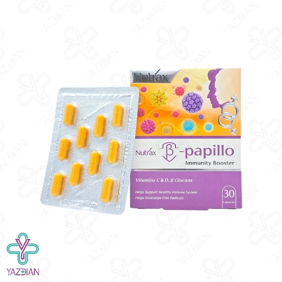کپسول بتا پاپیلو نوتراکس (Beta Papillo Nutrax capsules – 30 pcs) با دارا بودن ترکیبات موثری که دارد موجب تقویت سیستم ایمنی بدن شده ، این محصول در کاهش علائم بیماری هایی که در اثر نقص سیستم ایمنی بروز می کند نیز موثر می باشد مانند زگیل تناسلی یا پایپلومای انسانی و بیماری های ویروسی مانند سرماخوردگی را به سرعت بهبود بخشیده و طول مدت بیماری را کاهش می دهد، کپسول بتا پاپیلو از انواع ویتامین ها و مواد معدنی تشکیل شده است، ویتامین C از ترکیبات موجود در این محصول می باشد که دارای خواص آنتی اکسیدانی بوده که موجب ترمیم و بازسازی بافت ها شده و از ریه ها در برابر عفونت های تنفسی محافظت کرده و موجب تقویت سیستم ایمنی بدن می شود، بتاگلوکان ها نیز از دیگر ترکیبات این محصول بوده که موجب فعال شدن نوتروفیل ها شده و از بدن در برابر ویروس پاپیلومای انسانی محافظت می کند، عصاره گیاه آقطی سیاه از دیگر ترکیبات این محصول بوده که سرشار از آنتی اکسیدان ها بوده و از بدن در برابر رادیکال های آزاد محافظت می کند و موجب تکین و بهبود عفونت های تنفسی نیز می شود، روی و ویتامین D موجود در این محصول نیز موجب تقویت سیستم ایمنی بدن می شود و از بدن در برابر سرماخوردگی و آنفولانزا به خصوص در فصل سرما محافظت می کند.