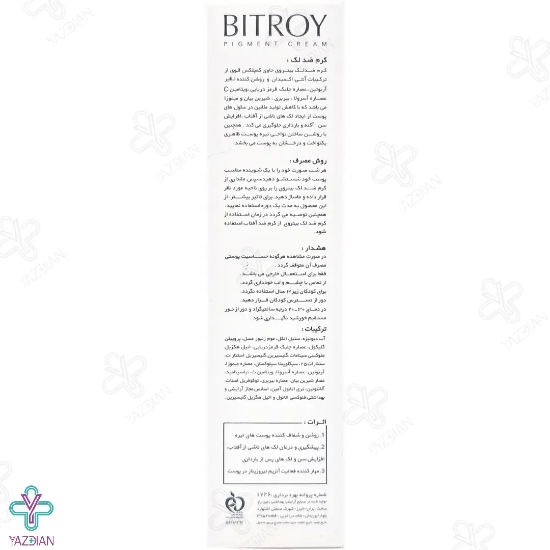 کرم ضد لک قوی صورت بیتروی (Bitroy Strong anti-blemish face cream 30 ml) لک های پوستی را درمان و از ایجاد دوباره ی آن ها جلوگیری می کند. این کرم سفید کننده صورت به دلیل داشتن ترکیبات موثر و قوی در خود تولید چربی را در پوست تنظیم می کند. این کرم به آسانی ویتامین ها و مواد مغذی مورد نیاز را برای پوست فراهم کرده و هم چنین از پیری زودرس آن نیز پیشگیری می کند.