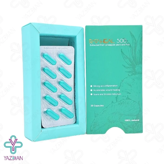 کپسول بروملین راتاهیل پویش درمان راتا ( Bromelain Rataheal capsules pooyesh darman rata - 30 PCS) زخم های جراحی و سوختگی را بسیار سریع درمان می کند،از دیگر ویژگی های این محصول این است که خون مردگی و کبودی ایجاد شده در پوست را برطرف می کند،استفاده از این کپسول باعث می شود تا دوران نقاهت پس از انجام جراحی بسیار کاهش پیدا کند، هم چنین جای زخم را ترمیم می کند،بروملین از ترکیبات به کار رفته در این محصول است و از ایجاد التهاب، درد و تورم جلوگیری می کند.