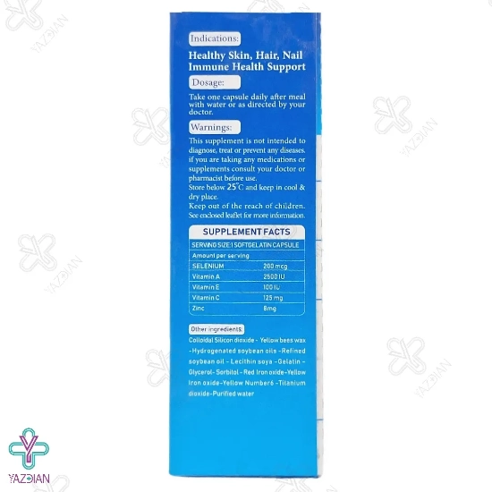 در فرمولاسیون این مکمل از ویتامین های مؤثری از جمله ویتامین A استفاده شده است و بدین جهت می تواند ضمن کاهش دادن علائم اگزما و پسوریازیس، التهابات پوستی را به خوبی درمان نماید. ویتامین E موجود در آن نیز دارای خاصیت آنتی اکسیدانی فوق العاده ای می باشد و می تواند با پرداختن به مبارزه با رادیکال های آزاد، اثرات مخرب آن ها را مهار کند. دیگر ویتامین به کار رفته در این مکمل ویتامین C می باشد که می تواند تولید کلاژن در پوست را افزایش داده و ضمن روشن تر کردن رنگ پوست، از بروز سرطان پوست و ایجاد چین و چروک های پوستی جلوگیری نماید.