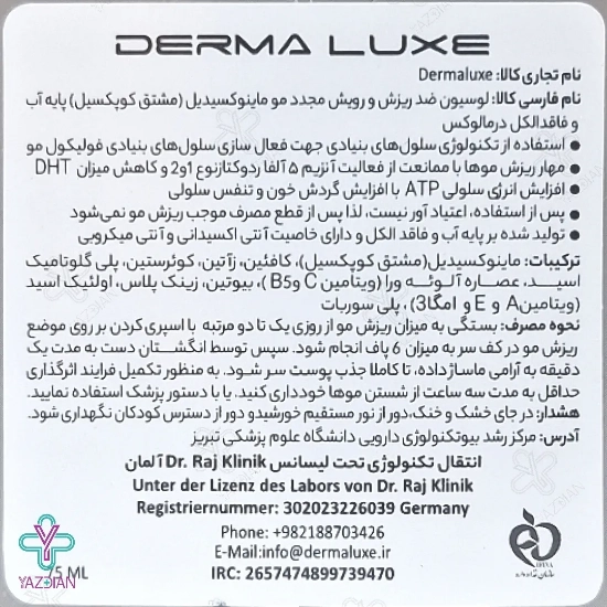 لوسیون تقویت کننده مو ماینوکسیدیل درمالوکس (Derma Luxe Anti Hair Loss Lotion 75 ml) با دارا بودن ترکیبات مؤثره ماینوکسیدیل و کافئین به همراه ویتامین های A، E و B5 در فرمولاسیون خود می تواند گردش خون در پوست سر را بهبود بخشیده و ضمن جلوگیری از ریزش موها، سرعت رشد موهای جایگزین را افزایش دهد.