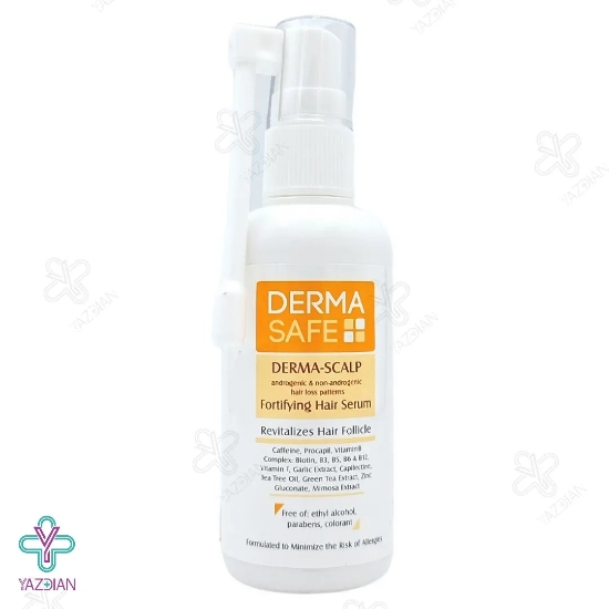 سرم تقویت کننده موی سر درماسیف - 65 میلی لیتر (Derma Safe Scalp Fortifying Hair Serum 65ml) از دسته محصولات مراقبت از مو می باشد که با برخورداری از ترکیبات هدفمند از جمله روغن و عصاره های گیاهی ویتامین های گروه ب می باشد که از انواع الگوهای ریزش مو (آندروژنیک و غیر آندروژنیک) جلوگیری کرده و فعالیت آنزیم ۵_آلفا ردوکتاز را متوقف می کند. این محصول با تحریک و افزایش خون مویرگی فولیکول ها، ریشه موها را تقویت و تغذیه رسانی کرده و محرک رشد موهاست. ضمنا خاصیت ضد شوره ای نیز دارد و با خاصیت آنتی اکسیدانی نیز فعالیت رادیکال های آزاد را خنثی می کند.