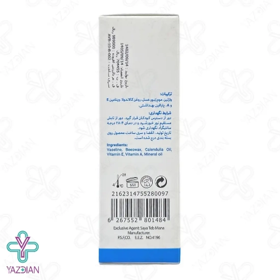 روغن کالاندولا، موم زنبور عسل، ژله نفتی، ویتامین A، ویتامین E، روغن طبیعی.