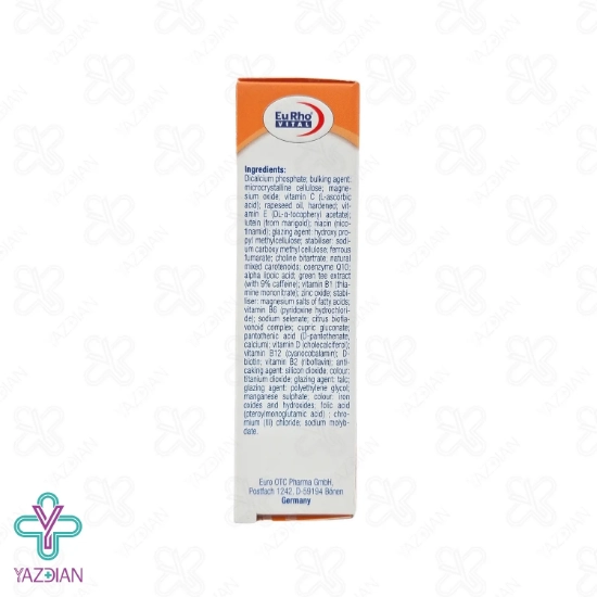 این مولتی ویتامین برند یورویتال حاوی کوآنزیم کیوتن، کوآنزیم کیوتن، آلفالیپوئیک اسید، لوتئین، بیوفلاونوئیدهای مرکبات، عصاره چای سبز، کاروتنوئیدهای طبیعی و کولین می باشد.