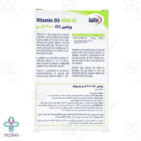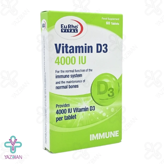 قرص ویتامین د3 4000 یوروویتال (Eurho vital vitamin D3 4000 ) یک مکمل مناسب جهت استحکام استخوان ها می باشد و موجب افزایش جذب کلسیم و فسفر از روده و کاهش دفع توسط کلیه ها می شود که در نتیجه موجب متابولسیم استخوان ها و جلوگیری از پوکی استخوان می شود قرص ویتامین د3 موجب تقویت سیتم ایمنی بدن شده و مانع از ایجاد مشکلات در اثر کمبود ویتامین د در بدن می شود در صورتی که بدن به اندازه کافی ویتامین د نداشته باشد استخوان ها نرم و شکننده می شوند و مشکلاتی مانند راشیتیسم در کوکان و استئومالاسی در بزرگسالان را ایجاد می کند این محصول موجب حفظ تراکم استخوان ها می شود قرص ویتامین د3 موجب کاهش التهاب و جلوگیری از ابتلا به بیماری های عفونی، باکتریایی و ویروسی می شود ویتامین د هم چنین از ابتلا به بیماری های قلبی و عروقی جلوگیری می کند و منجر به حفظ سلامت قلب و عروق می شود.
