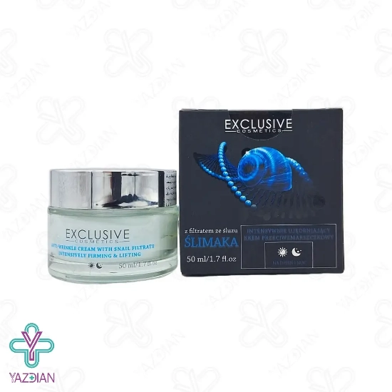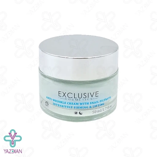 کرم ضد چروک حلزون اکسکلوسیو - 50 میلی لیتر (Exclusive Cosmetics with Snail Mucus Filtrate Intensively Firming Appearance Anti Wrinkle Cream) با بهره گیری از بزاق تصفیه شده حلزون، عملکرد فوق العاده ای جهت یکدست سازی توناژ پوست دارد و بافت پوست را سفت و مستحکم می سازد. این کرم سرساز مواد مغذی و تقویت کننده پوست می باشد و رطوبت رسانی عمقی و موثری به پوست می کند و از دهیدراته و خشکی آن پیشگیری می کند. این عملکرد پروسه پیر شدن پوست را به تعویق می اندازد و در جوانسازی پوست نقش موثری دارد.