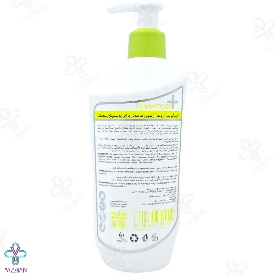 کرم آبرسان پمپی هرمودر حاوی روغن زیتون (Hermoder pumpy moisturizing cream containing olive oil 300 ml) باعث آب رسانی و مرطوب شدن پوست می شود. در این محصول چربی بسیار کمی به کار رفته است به همین جهت سبب براقی و چرب شدن بیش از اندازه ی پوست نمی شود.
