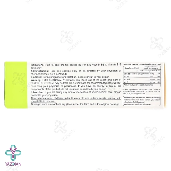 کپسول آهن ففول دئودنال اینترافارم (Intrapharm Fefol Doudenal 30 Capsules) با دارا بودن دوز بالای آهن به فرم بیس گلیسینات در فرمولاسیون خود می تواند نیاز روزانه بدن به آهن را تأمین کرده و از بروز کم خونی ناشی از فقر آهن جلوگیری نماید. ویتامین C موجود در این مکمل نیز جذب آهن را افزایش می دهد.