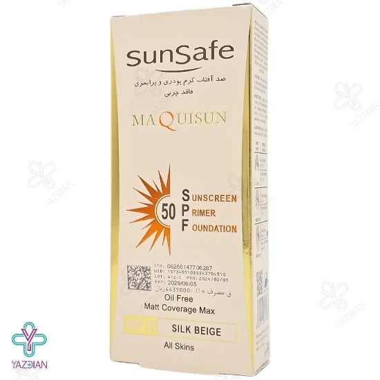 کرم ضد آفتاب SPF50 پودری و پرایمری سان سیف - بژ ابریشمی (MAQUISUN foundation suns cream spf 50 SUNSAFE) با برخورداری از فیلتر های محافظت پوست در برابر اشعه های مضر خورشید، تاثیرات مخرب UVA,UVB,IR را خنثی می کند. ضمنا این کرم ضد آفتاب رنگی با برخورداری از ترکیبات مرطوب کننده از جمله گلیسیرین، ضمن حفظ رطوبت پوست، پوست را بطور عمقی آبرسانی کرده و از بروز خشکی های پوستی نیز جلوگیری می کند. ضمنا بعلت خاصیت پرایمری خود، یک پایه آرایشی عالی می باشد که دوام آرایش شما را تا حد زیادی بیشتر می کند.