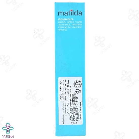 لانولین یکی از ترکیبات این بالم لب است که به عنوان یک نرم کننده ی بسیار قوی و تاثیر گذار عمل کرده و در محیط های خشک تبخیر نمی شود و بی خطر و غیر سمی است. وجود کاپریلیک تری گلیسرید و چربی های طبیعی در این محصول نیز با مرطوب نگه داشتن لب ها ترک و خشکی آن را درمان می کند. عصاره ی رد بری نیز در بالم لب ماتیلدا یک اسانس و طعم دهنده است. هم چنین در این محصول به هیچ عنوان پارابن و رنگ استفاده نشده است؛ به همین دلیل در کودکان با خیال راحت می توان از آن استفاده کرد.