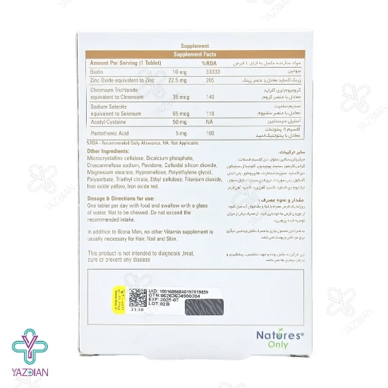 قرص تقویت پوست و مو آقایان بایونا من نیچرز اونلی (Natures Only Biona Men 30 Tabs) با دارا بودن ویتامین ها و مواد معدنی در فرمولاسیون خود می تواند نیاز روزانه بدن به این ترکیبات مهم را فراهم آورد و ضمن بهبود و حفظ سلامت پوست، مو و ناخن، سیستم ایمنی بدن را نیز تقویت نماید.