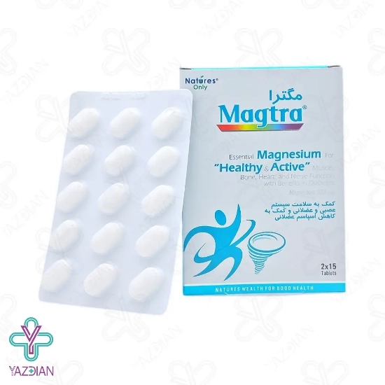قرص منیزیم 350 مگترا نیچرز اونلی (Natures only Magtra Magnesium 350 tablets mg – 30 pcs ) یک مکمل جهت بهبود سیستم عصبی، تجزیه مواد غذایی به ریز مغذی ها، عملکرد عضلات، استحکام استخوان ها و دندان و تقسیم سلولی مورد نیاز می باشد، قرص منیزیم موجب شل شدن و رفع گرفتگی عضلات من جمله عضلات قلب می شود، در صورتی که مقدار منیزیم در بدن شما کم باشد به صورت میگرن در سیستم عصبی خود را نشان می دهد، اگر منیزیم به مقدار کافی دریافت کنید موجب کاهش خطر ابتلا به پوکی استخوان، کاهش فشار خون و کاهش استرس می شود، این ماده در بسیاری از مواد غذایی موجود می باشد و به صورت طبیعی تمام منیزیم مورد نیاز خود را دریافت می کنید و هم چنین کلیه ها مقدار منیزیمی که هنگام دفع ادرار از دست می دهیم را در سطح بدن تنظیم می کند و در صورت سطح پایین منیزیم می توانید از مکمل های حاوی منیزیم نیز استفاده کنید، افرادی که بدن آن ها منیزیم کافی ندارد با بی اشتهایی، حالت تهوع، احساس ضعف و خستگی، اسهال، بی حسی، سوزن سوزن شدن و ضربات نامنظم قلب رو به رو هستند، منیزیم نوعی مینرال است که برای بسیاری از آنزیم های بدن مفید می باشد که برخی از آن ها مواد غذایی را به انرژی در بدن تبدیل می کند، این محصول دارای دو شکل مختلف منیزیم شامل سترات منیزیم و اکسید منیزیم می باشد که فاقد رنگ مصنوعی، طعم دهنده، نگه دارنده، گلوتن، ذرت، سویا، گندم، نشاسته، شکر و مخمر می باشد و از ایجاد واکنش و حساسیت احتمالی می کاهد.