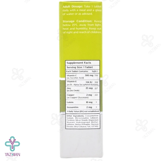 لوتئین و زاگزانتین دو ترکیب مهم به کار رفته در این قرص است که علاوه بر تقویت ماهیچه ی چشم از خشکی آن پیشگیری کرده و هم چنین مانع از تنبلی چشم شده و رادیکال های آزاد را نیز خنثی می کند. ویتامین C و E از دیگر ترکیبات موجود در این محصول بوده که باعث کاهش بیماری های چشمی مانند آب مروارید شده و هم چنین سبب مراقبت از شبکیه ی چشم و افزایش قدرت بینایی می شود. وجود مس و روی نیز در این قرص باعث انتقال ویتامین A از کبد به چشم ها می شود زیرا این ویتامین یک ماده ی مغذی لازم برای چشم است.