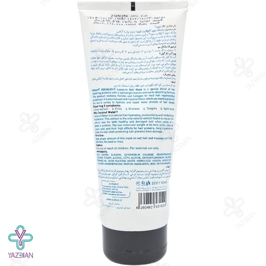 ماسک مو آکولایت شون (بدون آبکشی) - 200 میلی لیتر (Schon Aqua Light Leave In Hair Mask 200ml) با برخورداری از مقادیر زیادی از کراتین و کلاژن، عملکرد فوق العاده ای در احیا و بازسازی موهای صدمه دیده دارد و با تغذیه رسانی به ساقه ی موها، آن ها را از هر گونه آسیب های محیطی حفظ می کند. ضمنا این محصول با برخورداری از آب نارگیل در ترکیبات خود، موها را بطور عمقی مرطوب و آبرسانی کرده و با گستردن یک لایه محافظتی قوی به دور موها، از بروز آسیب ناشی از ابزار استایلینگ جلوگیری می کند. استفاده از ماسک تقویت مو آکولایت شون از بروز آسیب های مویی از جمله وزی، گره خوردگی و موخوره جلوگیری می کند.
