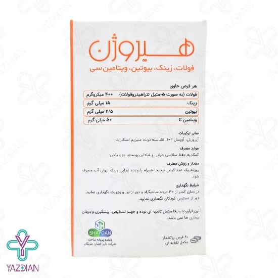 قرص ضد ریزش مو هیروژن شایگان (Shaygan Darou Afshan Hairogen ۶۰ Tablets) با غنی بودن از ویتامین H یا همان بیوتین مانع از ریزش مو ها می شود و حافظ سلامت پوست، مو و ناخن می باشد. در اثر کمبود این ویتامین علائمی مثل پوسته پوسته شدن پوست صورت، بی حسی انگشتان دست و پا، راشهای قرمز، ریزش مو، ورم ملتحمه، افسردگی و خستگی ممکن است رخ دهد. در اثر استفاده طبق دوز مصرفی پیشنهادی از بروز این علائم جلوگیری می شود.
