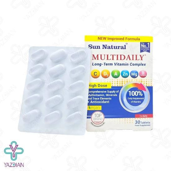 قرص مولتی دیلیسان نچرال - 30 عددی (Sun Natural Multi Daily ۳۰ Tablets) با بهره گیری از گستره ای از مواد معدنی و ویتامین ها، مواد مغذی مورد نیاز بدن را تامین کرده و حافظ سلامت عمومی بدن می باشد. بعلاوه این قرص تقویت کننده سیستم ایمنی بدن نیز می باشد و حافظ سلامت و شادابی پوست، مو و ناخن است. بعلاوه خاصتی آنتی اکسیدانی نیز دارد و با عوامل استرس اکسیداتیو مقابله می کند و در حفظ سلامت سلولی موثر می باشد. در این فراورده از رنگ مصنوعی، مخمر، نمک و مواد نگهدارنده استفاده نشده است. جت اطلاع و خرید بهترین مولتی ویتامین های موجود به سایت ما مراجعه فرمایید.