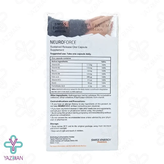 کپسول تقویت سیستم عصبی نوروفورس سوئیس انرژی (Swiss Energy Neuroforce 30 Capsules) از جمله مکمل های تخصصی است که با برخورداری از ویتامین های بکمپلکس، در تولید ناقل های شیمیایی نقش اساسی دارد و عملکرد سیستم عصبی را بهبود می بخشد. فرمولاسیون آهسته رهش این کپسول باعث شده است تا مواد موثره ی آن به تدریج وارد بدن شود و بدین صورت جذب طولانی و موثری خواهد داشت. این موضوع باعث به حداقل رسیدن عوارض جانبی و بهبود اثربخشی آن می شود.