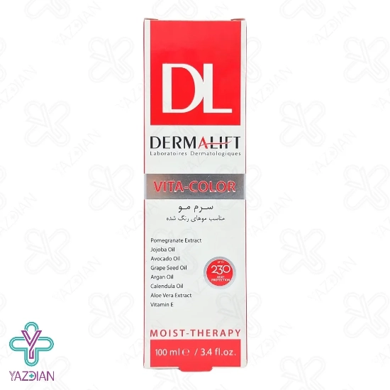 رنگ کردن موها را دچار آسیب و خشکی می کند و اگر مراقبت های لازم پس از رنگ کردن انجام نشود موها توسط مواد شیمیایی استفاده شده دچار آسیب می شوند و هم چنین برای ثابت ماندن و درخشان شدن رنگ موها نیاز به مراقبت هایی می باشد، سرم موهای رنگ شده ویتا کالر درمالیفت(Vita color Dermalift colored hair serum – 100 ml) با دارا بودن ترکیبات موثر تمام نیازهای مو را تامین کرده و موجب نرم و مرطوب شدن مو شده و علاوه بر تقویت موها موجب ساقه مو را نیز نرم و لطیف می کند و مانع از خشکی مو و پوست سر می شود، این محصول هم چنین موجب تثبیت رنگ مو و درخشان شدن آن نیز می شود. روغن آرگان یکی از ترکیبات موجود در این محصول می باشد که موجب نرم و لطیف شدن موها شده و دارای ویتامین E و اسیدهای چرب فراوان می باشد که همین خاصیت آنتی اکسیدانی ضمن تقویت موها از آن نیز محافظت می کند، روغن کالاندولا نیز یکی دیگر از ترکیبات موجود در این محصول می باشد که موجب بهبود گردش خون در فولیکول های مو شده که ضمن استحکام و قوی تر شدن موها به ترمیم و بازسازی آن ها نیز کمک کرده و از ایجاد موخوره نیز جلوگیری می کند، روغن آووکادو موجود در این محصول دارای خواص مرطوب کنندگی می باشد و مو را به صورت عمقی نرم می کند و روغن جوجوبا موجود در این محصول نیز با غنی بودن از ویتامین ها و مواد مغذی ساقه مو را تغذیه کرده و مو را رطوبت رسانی کرده و از شکنندگی آن ها جلوگیری می کند.