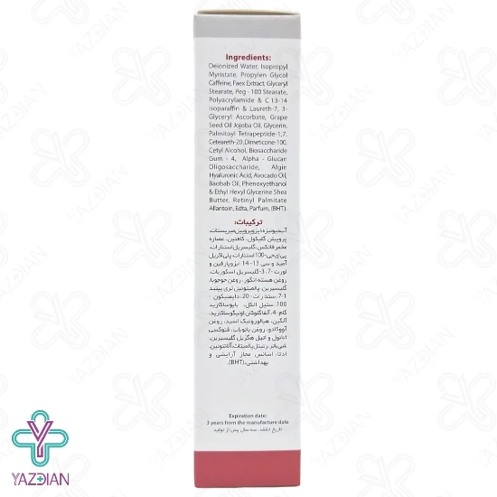 روغن کتان، استرهای آمینو پروپان دیولهای روغن پالم، آی دیونیزه، کافئین، پروپیلن گلایکول، ایزوپروپیل میریستات، کربومر، روغن آووکادو، هیدروژنیتد پلی ایزوبوتن و هیدروژنیتد پلی دسن، دایمتیکون ۳۵۰، ویتامین ای، فنوکسی اتانول و اتیل هگزیل گلیسیرین، اسانس مجاز ارایشی و بهداشتی، ویتامین آ، عصاره جینسنگ، عصاره سرخارگل، آربوتین، پالمیتویل تری پپتاید-۱، تری اتانول آمین، روغن هسته انگور.