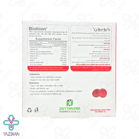کمبود آهن در بدن باعث ایجاد مشکلاتی مثل کم خونی، خستگی، ضعف عضلانی، مشکلات شناختی و غیره می شود به همین دلیل استفاده از یک محصول مناسب برای برطرف شدن این مشکلات توصیه می شود، ویال آهن خوراکی بایوبیون زیست تخمیر (Zist Takhmir Biobion 10 Vials) آهن مورد نیاز بدن را فراهم کرده و از کم خونی به دلیل فقر آهن پیشگیری می کند، از دیگر ویژگی های این محصول این است که سطح انرژی بدن را افزایش داده و میزان خستگی را بسیار کاهش می دهد، هم چنین میزان ساخت گلبول های قرمز در بدن را نیز افزایش می دهد.