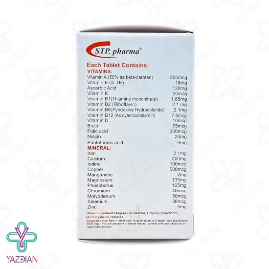 روزانه یک عدد قرص مولتی ویتامین اس تی پی فارما را با معده پر به همراه آب کافی میل نمایید.