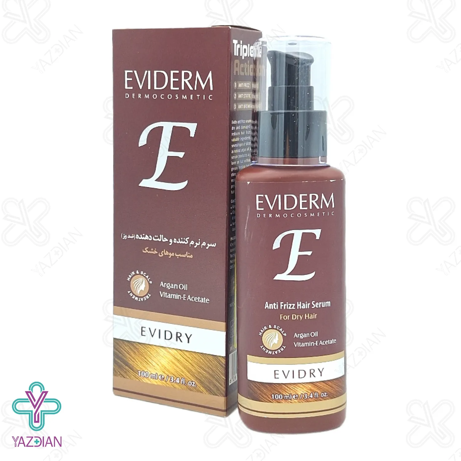 سرم مو آنتی فریز موهای خشک مدل EVIDRY اویدرم ( Eviderm Evidry Anti Frizz Hair Serum 100 ml) دارای ترکیباتی فوق العاده نظیر روغن آرگان، ویتامین E، فیلتر ضد آفتاب و انواع پلی سیلیکون ها بوده و می تواند بر روی تارهای مو لایه ای محافظتی ایجاد نماید و بدین گونه ضمن تثبیت نمودن رنگ موها، نرمی، لطافت و درخشندگی موها را افزایش دهد.