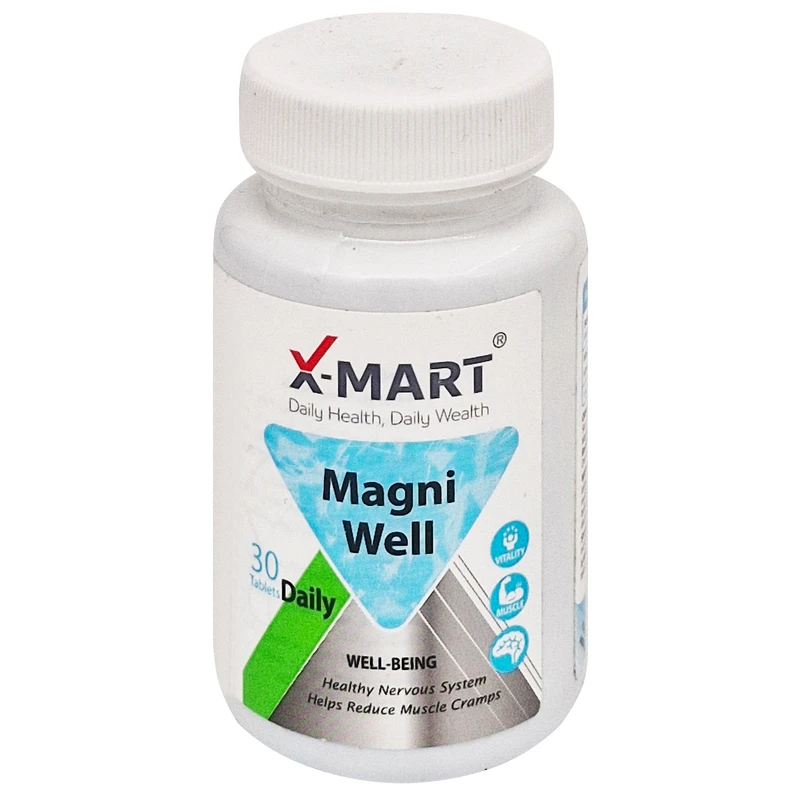قرص منیزیم ب6 مگنی ول ایکس مارت - 30 عددی (X Mart Magni Well Tablets) با بهره گیری از منیزیم و ویتامین B6 در فرمولاسیون خود، یک مکمل رژیمی غذایی عالی جهت بهبود عملکرد عضلات هم در آقایان و هم در خانم ها می باشد. عملکرد این قرص بدین صورت است که با کاهش میزان اسید لاکتیک بدن، از گرفتگی عضلانی جلوگیری کرده و از خستگی ناشی از تمرینات ورزشی می کاهد. این فراورده تا حد چشمگیری علائم سندرم پیش از قاعدگی را بهبود می بخشد و در کاهش شدت میگرن و بهبود کیفیت خواب موثر واقع می شود.