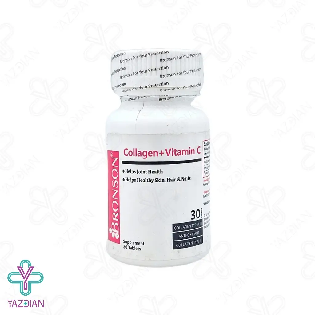 قرص کلاژن ویتامین ث برانسون - 60 عددی (Bronson Collagen + Vitamin C - 60 Tabs) با فرمولاسیون تخصصی ای که دارد، جهت تامین و حفظ سلامت پوست، مو، ناخن و مفاصل طراحی شده است. بدین صورت که ساختار پوست را بهبود می بخشد و خاصیت ارتجاعی آن را زیاد می کند. بعلاوه به دلیل بهره گیری از کلاژن نوع I و III، روند پیری پوست را به تعویق می اندازد و عمق چین و چروکهای پوستی را کم می کند؛ بدین ترتیب باعث افزایش استحکام و جوانسازی پوست می شود.