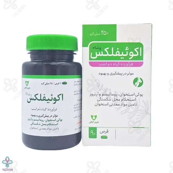 قرص گیاهی تقویت مفاصل اکوئیفلکس وشا دارو( Equiflex) دارای پودر گیاه دم اسب به مقدار 250 میلی گرم بوده و به عنوان منبعی غنی از عناصر معدنی ضروری مفاصل و استخوان ها، از پوکی استخوان جلوگیری کرده و علاوه بر بهبود آرتروز و روماتیسم، موها و ناخن ها را تقویت می کند.