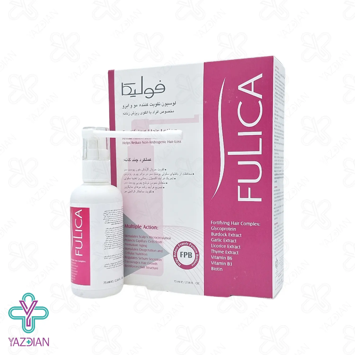 لوسیون تقویت کننده و ضد ریزش مو بانوان فولیکا (Fulica Anti Hair Loss Lotion For Women 75 ml) دارای کمپلکس تقویت کننده و ضد ریزش می باشد و با هدف قطع ریزش موی سر غیر آندروژنیک تهیه شده است.