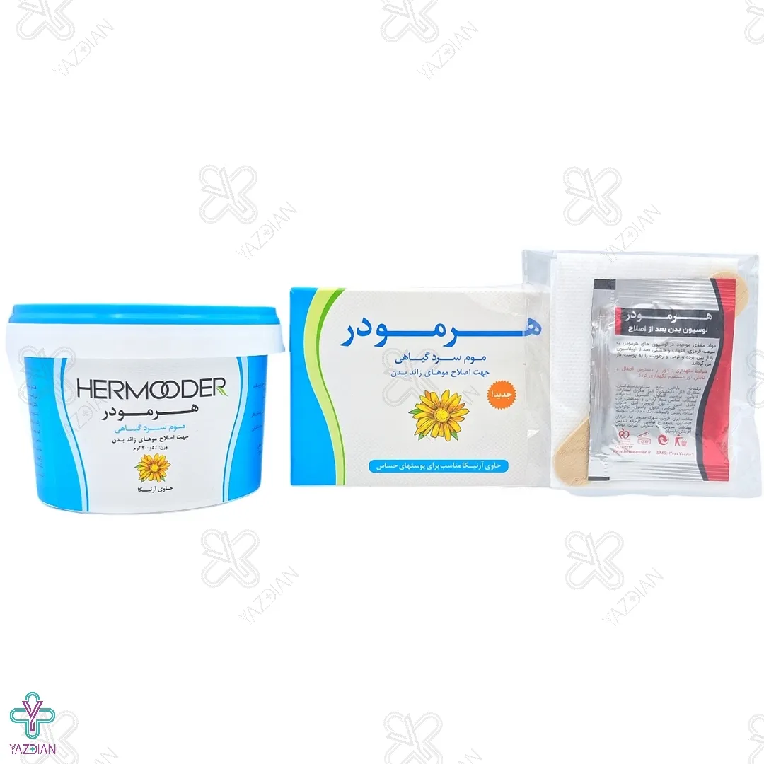 موم سرد گیاهی هرمودر حاوی عصاره آرنیکا، با خاصیت ضد باکتری و ضد قارچ، مسکنی قوی و طبیعی بوده و در اپیلاسیون به کار برده می شود. برای نابود کردن موهای زاید زیر بغل، دست و پا می توان از این محصول استفاده کرد و آن ها را از ریشه از بین برد.