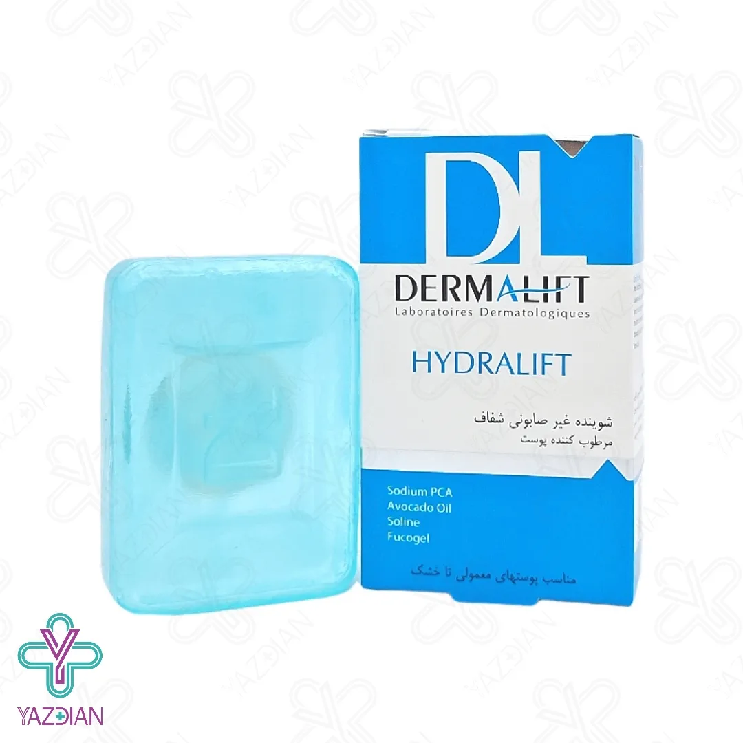 پن شفاف مرطوب کننده هیدرالیفت درمالیفت مناسب پوست معمولی تا خشک Dermalift Hydralift Transparent Moisturizing Syndet Bar For Normal And Dry Skins شوینده صورت و بدن غیر صابونی و ملایم برای پوست های خشک و معمولی است؛ PH آن سازگار با پوست بوده و پاک کننده آلودگی، چربی و مواد آرایشی از سطح پوست است.