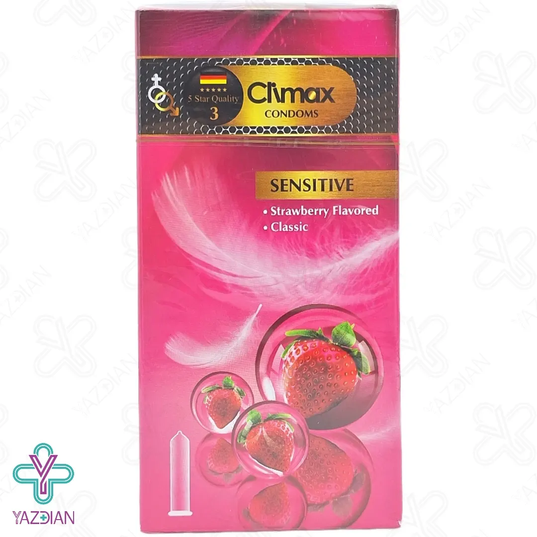 کاندم حساس و نازک کلایمکس یکی از انواع کاندوم ساده است که دارای مواد روان کننده و رایحه توت فرنگی می باشد. به منظور اطمینان و امنیت بیشتر در نوک این محصول، مخزن ذخیره ای برای نگهداری اسپرم طراحی شده است.