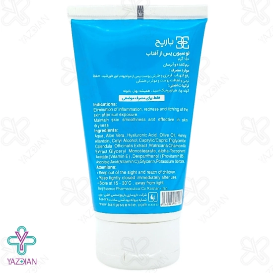 لوسیون پس از آفتاب باریج اسانس یک محصول کاملاً خاص است که برای کمک به تسکین و آرامش پوست پس از آفتاب تولید شده است. محصول نامبرده فوق شامل موادی مثل آلوئه ورا، گل همیشه بهار، روغن آووکادو، هیالورونیک اسید، بابونه و ویتامین های B و C می باشد.
