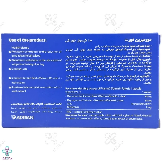 کپسول آرامبخش دورمیرین فورت تحت لیسانس فارما اس سوییس و به سفارش شرکت دارویی ایرانی توسعه طب آدریان سلامت تولید و بسته بندی میشود.