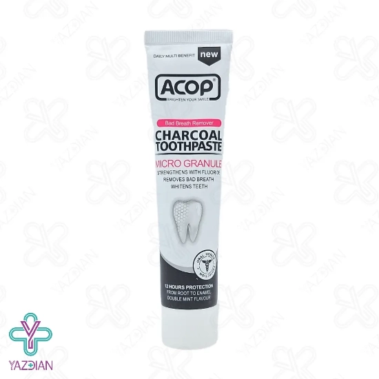 خمیر دندان زغالی آکوپ (Acop charcoal toothpaste - 90 gr) دارای زغال فعال یا کربن اکتیو است و ذرات ریز که باعث تغییر رنگ دندان ها می شود را از روی سطح دندان ها پاک می کند و به همین دلیل دندان ها درخشان و سفید می شود، از دیگر ویژگی های این محصول این است که هیچ نوع رنگ سیاهی بر روی زبان، مخاط دهان، لباس، سینک و تغییر رنگ برس مسواک ایجاد نمی کند.