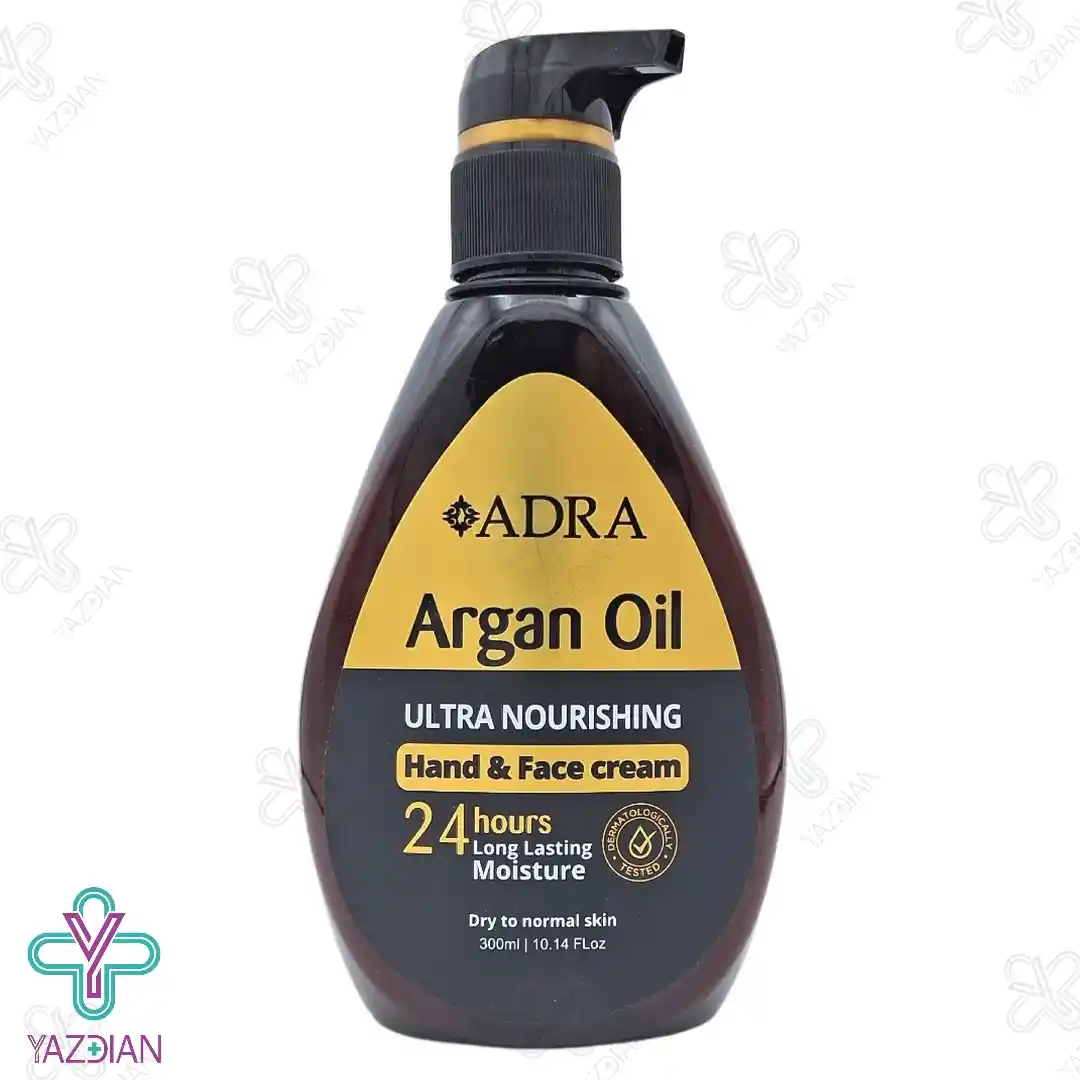 کرم مرطوب کننده ی حاوی آرگان پمپی آدرا (ARGAN OIL Hand a face cream ADRA) دارای روغن آرگان است که این روغن منبع مهمی از ویتامین های E، A، امگا 6 و 9 است، این محصول سبب روشن و شفاف شدن پوست می شود.